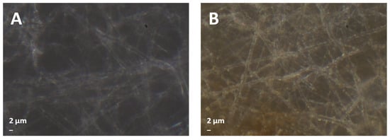Illustrative optical microscope images: (A) PCL coated for 10 min with AL-OA; (B) PCL coated for 120 min with AL-OA.