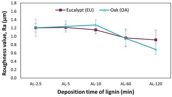 Figure 5 illustrates the trend of the average roughness (Ra) as a function of the increasing coating time of lignin. A decrease in the average roughness (Ra) is generally observed with an increase in the coating time. In particular, it is observed that for coating times up to 5 min, the average value of Ra tends to remain almost constant, close to 1.2 µm for both lignin grades used. After 10 min of coating, in the case of EU, the roughness decreases to 1.16 µm, while in the case of OA, a slight increase to 1.27 µm is measured. For long lignin coating times, the roughness value decreases and converges to 0.95 µm for both EU and OA after 60 min. After 120 min, in the case of EU, the roughness decreases slightly to 0.92 µm, while in the case of OA, the decrease in roughness is greater, dropping to 0.687 µm.