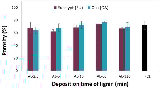 While the influence of the spray-coating step on porosity is negligible for all five deposition times under consideration, data indicates that for increasing deposition times (ref. AL-120 min in Figure 2 and AL-60 in Figure 4), the lignin nanoparticles tend to overlap and accumulate, filling in some of the pores underneath in the PCL layer. The relationship between the decrease in porosity and the formation of a conformal surface coating, confirmed by SEM for both AL-EU and AL-OA at 120 min, provides a rationale for the decrease in porosity for a longer deposition time of lignin vs. the reference PCL membrane. This is in agreement with the literature, and, for example, Ahmadpour et al. [50] reported a surface modification of a membrane composed of polyether imide (PEI) by a fine spray of material, leading to a reduction in the porosity of the filtration membrane.