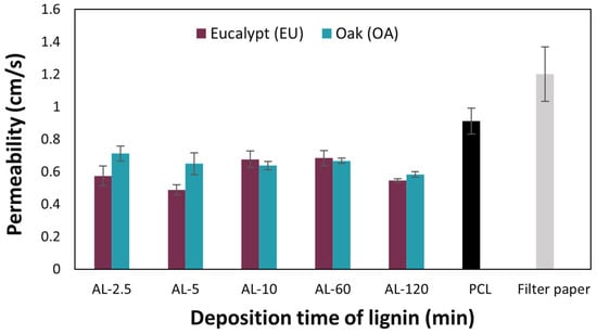 Regarding thickness measurements (Th), the average and SD for each sample are summarized in Table 3 (data net of the nominal filter paper support thickness equal to 110 µm for all cases), but do not offer an immediate interpretation for the observed trends. PCL/AL samples for coating times of 2.5 and 5 min, both with oak and eucalyptus lignin, exhibit thickness values similar to each other.