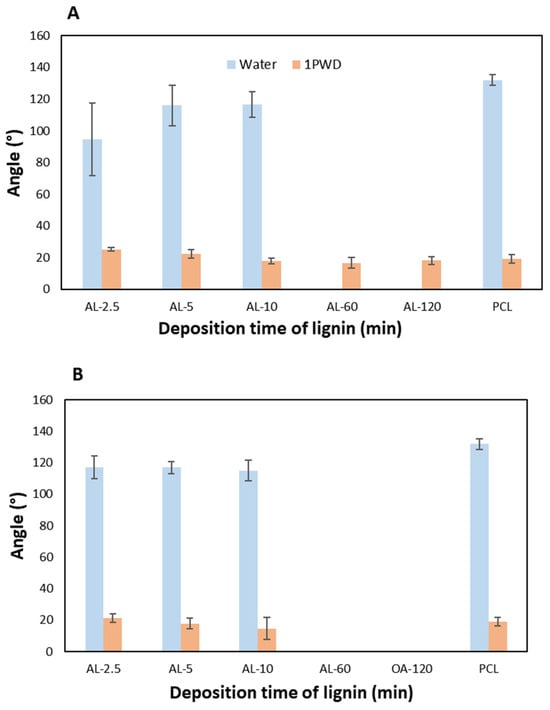 Water wettability tests on both AL-EU (Figure 8A) and AL-OA (Figure 8B) coatings decrease the water contact angle (WCA) compared to bare PCL membranes for electrospraying deposition times of 2.5, 5, and 10 min. For deposition times of 60 and 120 min, the effect is even more drastic and could not be measured with our method (i.e., 0° values in Table 7) because the water droplet completely disappeared, being quickly absorbed into the membrane within the set time (10 s) of the test and revealing a transition to full hydrophilicity of the surface. This behavior can be attributed to the abundance of polar hydroxyl and carboxylic groups present in the structure of the lignin nanoparticles [51,52,53]. This result is of particular technological interest as it is possible to modulate the hydrophilicity of PCL membranes by a small lignin amount, i.e., short deposition times. In turn, the possibility of delivering a substantial increase in hydrophilicity for rather short coating times is crucial for the deployment of a new “green” coating technology in high-throughput manufacturing, such as in the filtration industry and textile applications.