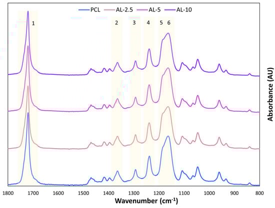 ATR-FTIR spectra comparison of the membrane PCL, AL-2.5, AL-5, and AL-10. PCL-specific peaks assignment: stretching vibration of the –C=O group (band 1), deformation vibrations of the –CH2 groups (band 2), stretching vibrations of C–O and C–C groups in the crystalline phase (band 3), asymmetric stretching vibrations of C–O–C (band 4), symmetric stretching vibrations of C–O–C (band 5), and stretching vibrations of C–O and C–C groups in the amorphous phase (band 6).