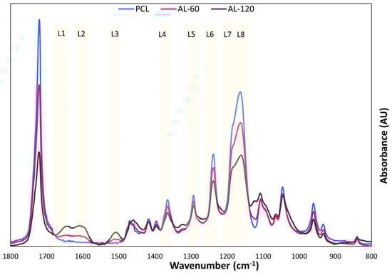 ATR-FTIR spectra comparison of the membrane PCL, AL-60, and AL-120. Lignin-specific peaks assignment: aromatic skeletal vibrations C=O stretching (band L1), C=C aromatic ring vibration (S > G) (band L2), C=C aromatic ring vibration (G > S) (band L3), aliphatic C-H stretching vibrations in CH3 (band L4), guaiacyl ring breathing (band L5), C−C, C−O, and C=O stretching in condensed G units (band L6), CH elongation in the G ring (band L7), and the typical S ring CO stretching (band L8).