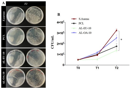 Our biological study is divided into two parts. At first, we compared three experimental conditions, for three time points (i.e., 0, 1.5, and 3 h), namely: bare PCL, AL-OA-10, and AL-EU-10. The results are shown in Figure 11. Such a biological assay was conducted to gain preliminary insight about the antibacterial performance; this was evaluated against the selected bacterial strain as representative for Gram-positive. As expected, the S. aureus culture in the absence of any material (positive control) kept growing steadily up to 3 h, rising from the initial concentration of 5 × 106 CFU/mL up to 3.2 × 107 CFU/mL. Instead, the blank PCL sample induced a weak reduction in bacterial growth. Between the two lignin-coated membranes, only AL-EU-10 showed a sizable antibacterial response, with a concentration of 1.3 × 107 CFU/mL at T2 (Figure 11 and Table 8) and a moderate, yet sustained, antimicrobial action throughout the time interval T1-T2 of 1.5 h. This represents a promising and encouraging result, recalling that the AL-EU-10 sample has a lignin density of just 0.014 mg/cm2 (ref. Table 4).
