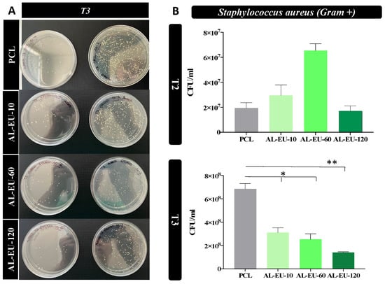 (A) Petri dishes obtained from S. aureus cultures with blank PCL and PCL-Lignin mats at two different serial dilutions (10−5 and 10−6) and last sampled time (4.5 h); (B) S. aureus bacterial population (CFU/mL) measured for PCL and coated samples at different time points: 3 (T2) and 4.5 (T3) hours (* p < 0.05 or ** p < 0.01).