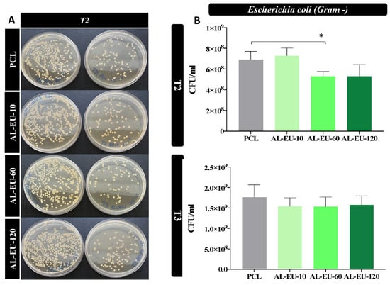 (A) Petri dishes obtained from E. coli cultures with blank PCL and PCL-Lignin mats at two different serial dilutions (10−5 and 10−6) and the second last sampled time (3 h); (B) E. coli bacterial population (CFU/mL) measured for PCL and coated samples at different time points: 3 (T2) and 4.5 (T3) hours (* p < 0.05).