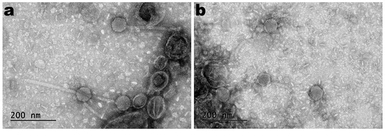 Negative staining TEM photomicrographs of phages SentS01L (a) and SentS01T (b).