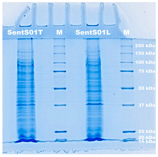 SDS-PAGE was used for determining the molecular weights of the bacteriophage SentS01L and SentS01T structural proteins, employing a Mini-PROTEAN® Tetra Cell from Bio-RAD (Hercules, CA, USA). In an Eppendorf, 500 µL of disruption buffer was added to each sample of bacteriophage suspension, and the mixture was boiled for ten minutes. After, 20 µL of sample supernatant and 5 µL of molecular weight markers were applied to the 5% acrylamide–bisacrylamide concentration gel/12% acrylamide–bisacrylamide separation gel, and electrophoresis was run for 60 min. Coomassie Brilliant Blue G-250 was used to dye the gel, after which it was photographed in high resolution for further analysis.