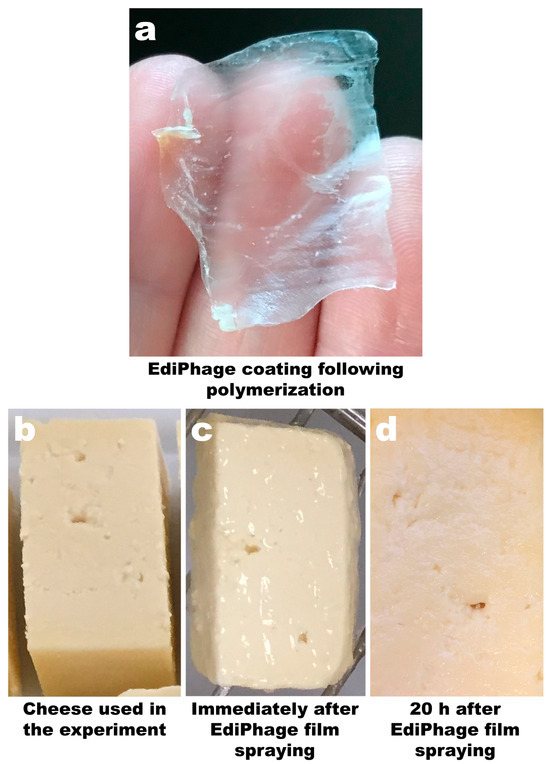 The technique allowed for the preparation of a coating with a film-like appearance, thickness, and flexibility suitable for use as an antibacterial coating for food applications. The coating was uniformly translucent and allowed the formation of a delicate film on the cheese samples (Figure 3a,c) with a thickness of 0.03 mm ± 0.009 (EdiPhage coating) and 0.03 mm ± 0.005 (phage-free coating). After a period of 20 h, the film remained unchanged, indicating that the addition of the phage cocktail did not alter the three-dimensional structure of the gel (Figure 3d).