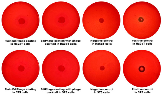 Evaluation of the Potential for Cytotoxicity of the Ediphage, Via Disc Diffusion Assay. The disc diffusion assay employing cell lines of immortalized human keratinocytes (HaCaT) and mouse fibroblasts (3T3) [26,27,28] was used for the evaluation of the cytotoxicity potential of the EdiPhage integrating the cocktail of lytic phages. A Petri plate containing the cells was filled with a small disc of sample (EdiPhage) and was incubated for 24 h at 37 °C in a 5% CO2 atmosphere. The same protocol was used for a negative control (a disc of innocuous paper) and positive control (latex). The presence of cytotoxicity was detected by the formation of a transparent halo due to cell lysis surrounding the sample tested [29].