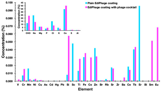 Elemental profiles of the plain EdiPhage coating and of the antibacterial bioactive EdiPhage coating integrating the phage cocktail, obtained via EDXRF.