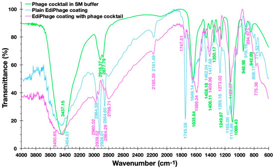 Figure 7 shows the FTIR spectra of the plain EdiPhage coating, the antibacterial bioactive EdiPhage coating integrating the phage cocktail, and the phage cocktail in SM buffer.