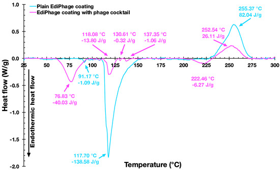 Differential scanning calorimetry thermograms of the EdiPhage coating devoid of phage particles (blue line) and of the EdiPhage coating integrating the cocktail of phage particles (magenta line).