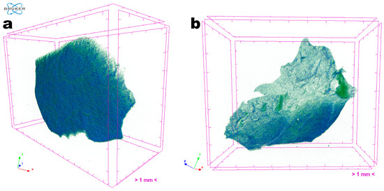 Images obtained through tomographic analyses via X-ray transmission of the EdiPhage coating loaded with phage particles: (a) front view of an EdiPhage sample and (b) slant view of the same EdiPhage sample. Three-dimensional image slices were gathered using an operating voltage set at 31 kV and electric current with 661 μA.