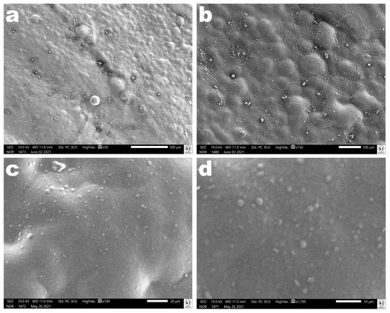 Photomicrographs of the polymerized antibacterial EdiPhage coating surface at several magnifications ((a): ×50, (b): ×150, (c): ×700, (d): ×1700). Images obtained via scanning electron microscopy (SEM) confirmed the formation of a coating with homogeneous characteristics.