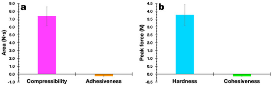 Results obtained for the compressibility and adhesiveness (a) and hardness and cohesiveness (b) of the antibacterial EdiPhage coating produced, integrating the cocktail of lytic bacteriophage particles.