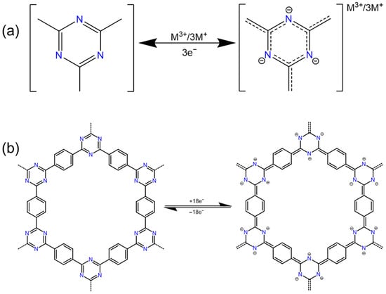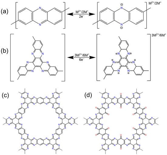 - Peng, C.X.; Ning, G.H.; Su, J.; Zhong, G.M.; Tang, W.; Tian, B.B.; Su, C.L.; Yu, D.Y.; Zu, L.H.; Yang, J.H.; et al. Reversible multi-electron redox chemistry of π-conjugated N-containing heteroaromatic molecule-based organic cathodes. Nat. Energy 2017, 2, 17074. [Google Scholar] [CrossRef]
