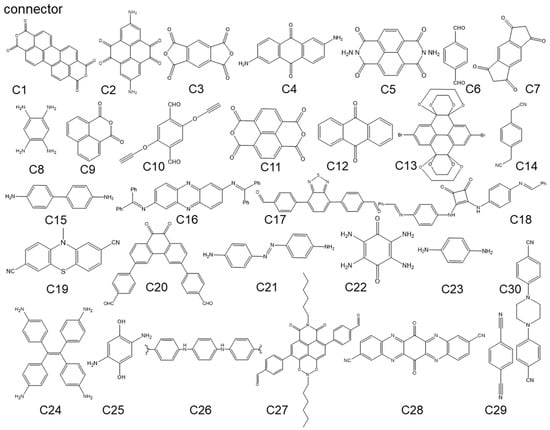 - Wu, M.M.; Zhao, Y.; Zhao, R.Q.; Zhu, J.; Liu, J.; Zhang, Y.M.; Li, C.X.; Ma, Y.F.; Zhang, H.T.; Chen, Y.S. Chemical Design for Both Molecular and Morphology Optimization toward High-Performance Lithium-Ion Batteries Cathode Material Based on Covalent Organic Framework. Adv. Funct. Mater. 2022, 32, 2107703. [Google Scholar] [CrossRef]