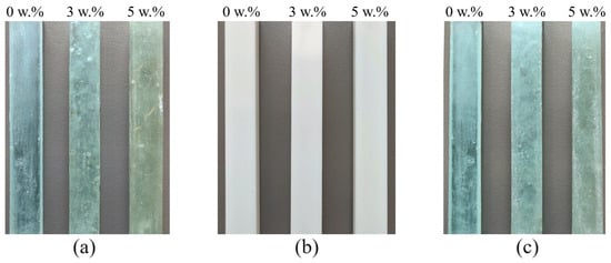 Photographs of the investigated polymer samples with different concentrations of sheep wool Wr (in w.%): (a) EP samples; (b) PU samples; (c) PES samples.