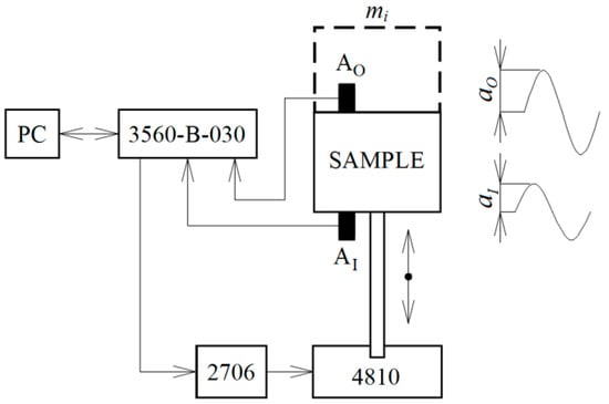 Experimental measurements of the displacement transmissibility of the tested sheep wool-filled polymer composites were performed using the method of harmonically excited mechanical vibrations within the frequency range of 2–1000 Hz. In addition, the vibration damping properties of the natural sheep wool fibers were evaluated in the frequency range from 2 to 200 Hz. The schematic diagram of the measuring apparatus (Brüel & Kjær, Nærum, Denmark) for evaluating the vibration damping properties of a linear single-degree-of-freedom (SDOF) system is shown in Figure 3. The measuring apparatus included a mini-shaker (BK 4810), a signal PULSE multi-analyzer (BK 3560-B-030), and a power amplifier (BK 2706). In the case of the harmonically excited mechanical vibrations, Equation (2) can also be expressed as follows:
