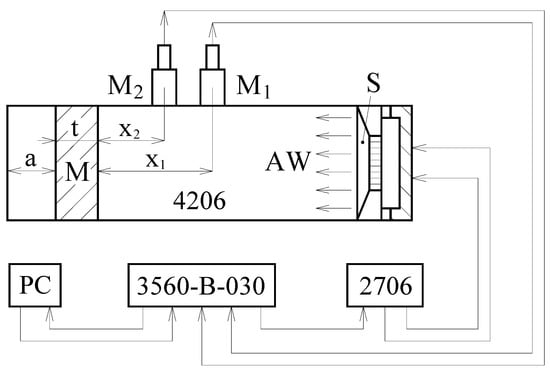 The schematic of the experimental apparatus for measuring frequency dependencies of the sound absorption coefficient. Legend of the abbreviations: a—air gap behind tested material sample, AW—acoustic wave, M—measured sample, M1 and M2—measuring microphones, S—sound source, t—sample thickness, x1 and x2—distances from the tested material sample to the microphones.
