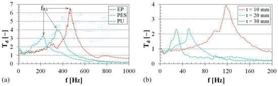The frequency dependencies of the displacement transmissibility Td are depicted in Figure 5 and Figure 6. Figure 5a compares the mechanical vibration damping properties of the three virgin polymer materials, i.e., without sheep wool content. It is evident that the material’s ability to damp mechanical vibrations (i.e., Td < 1) is generally achieved at higher excitation frequencies. Lower vibration damping properties were observed for the tested EP specimen, which effectively damped mechanical vibrations at frequencies f > 650 Hz. Contrarily, the PES specimen exhibited the ability to damp mechanical vibrations at lower excitation frequencies (i.e., at f > 420 Hz). This is reflected in the first resonance frequency (fR1) peak position, which generally increases with the increasing sample stiffness k (or the decreasing damping ratio ζ), as given in Equation (2). The mean values and corresponding standard deviations of the first resonance frequency for the tested polymer specimens are given in Table 3. The effect of the thickness of pure sheep wool, loaded with an inertial mass mi = 10 g, on the displacement transmissibility is shown in Figure 5b. It is evident that the vibration damping properties of sheep wool generally increased with increasing wool thickness t, as indicated by a shift in the first resonance frequency peak position to lower excitation frequencies (see Table 4).