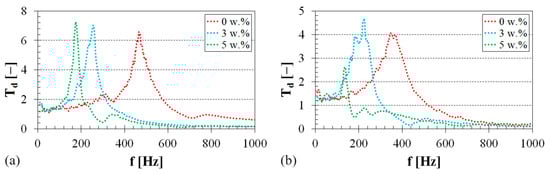 Effect of the sheep wool concentration on the displacement transmissibility: (a) EP–sheep wool composites, inertial mass mi = 90 g; (b) PU–sheep wool composites, inertial mass mi = 90 g.
