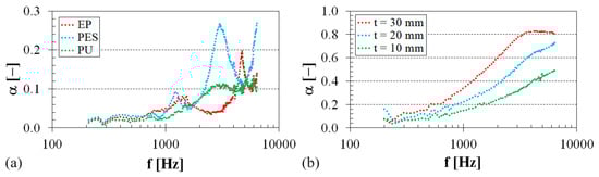 Frequency dependencies of the sound absorption coefficient: (a) PU–sheep wool composite, air gap size a = 10 mm; (b) PES–sheep wool composite, sheep wool concentration Wr = 3 w.%.