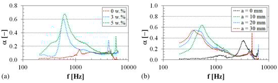 The air gap size a (see Figure 4) behind the tested polymer sample also significantly affects its ability to absorb sound. Figure 8b shows the effect of the air gap size on the sound absorption properties of the PES–sheep wool composite with a sheep wool concentration of Wr = 3 w.%. It is obvious that the air gap size generally led to improved sound absorption properties of this composite material. It is also visible that the primary sound absorption maximum of the sound absorption coefficient αmax1 was shifted towards lower excitation frequencies with the increasing air gap size a. Therefore, adjusting the air gap size behind the tested polymer sample can be used to improve the sound insulation properties, especially at low excitation frequencies. This phenomenon is characteristic of open-porous material structures, where the maxima of the sound absorption coefficient are proportional to odd multiples of quarter wavelengths at standing-wave antinodes and corresponding excitation frequencies [,].