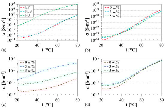 The temperature dependencies of the DC electrical conductivity for the investigated polymer composites are shown in Figure 9. It is evident that the DC electrical conductivity generally increased with increasing temperature, which correlates with the deteriorating electrical insulating properties of the polymer composites.
