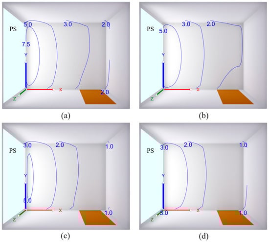 Distribution of the daylight factor DF (in %) at a height of 0.75 m above the room floor depending on the light transmission coefficient τ of the tested polymer specimens (PS): (a) τ = 0.72; (b) τ = 0.58; (c) τ = 0.43; (d) τ = 0.37.