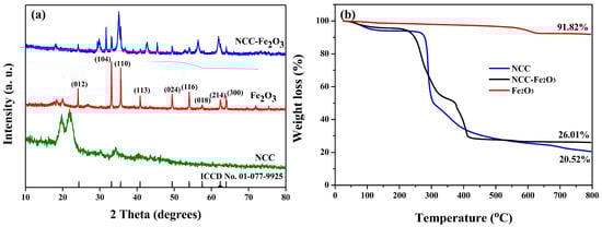 To analyze the content of NCC in the NCC–Fe2O3 composite, a thermal gravimetric analysis (TGA) was conducted from room temperature to 800 °C at a heating rate of 5 m−1, and the obtained results for the NCC–Fe2O3 composite, NCC, and Fe2O3 samples are shown in Figure 1b. According to the TGA curves, the NCC–Fe2O3 composite indicates a significant mass loss between 250 °C and 400 °C and maintains a constant weight above 400 °C, and the extant material weight is 26.01%. This is most likely attributed to the combustion of NCC in the NCC–Fe2O3 composite. In addition, the TGA curve of NCC shows a light mass loss of approximately 7–8% below 250 °C, corresponding to impurities and adsorbed water present in the air, which is consistent with the obtained result for NCC–Fe2O3, and the major weight loss displayed between 250 and 500 °C is considered to be related to the carbonization of NCC []. These results show that the carbonization of NCC can proceed at temperatures ranging from 250 to 500 °C and can be conducted simultaneously through thermal annealing of Fe2O3 nanoparticles into the carbonaceous structure during the composite synthesis. On the other hand, the Fe2O3 sample shows that there is not much change, with a weight loss of 8.18%, corresponding to adsorbed water, trace amounts of oxygen, and easily oxidizable matter in the sample. Based on the change in TGA curves, the content of NCC in the NCC–Fe2O3 composite can be calculated to be 65.81%.