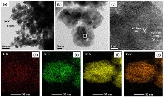 At the same time, the further detailed morphology of the NCC–Fe2O3 composite was observed via TEM and high-resolution TEM (HRTEM), and the obtained images are shown in Figure 3. TEM images (Figure 3a,b) present the uniformity of the anchored Fe2O3 particles on the NCC network, and a thin layer of NCC can be noted on the TEM images. Although some nanoparticle aggregation is observed in Figure 3a, the amorphous and large surface can be seen from the TEM images with higher magnification (Figure 3b), indicating the hierarchical porous structure and homogeneous dispersion of Fe2O3, which contribute to electron transportation and alleviate volume change to enhance the structural stability during the cycle. The HRTEM of the NCC–Fe2O3 composite (Figure 3c) shows the internal high-resolution lattice fringes, which confirm the existence of crystalline Fe2O3 particles with the lattice parameter of 0.25 and 0.269 nm corresponding to the (110) and (104) crystal plane of Fe2O3, showing consistency with the XRD results. In addition, the corresponding elemental mapping images (Figure 3d–g) for the elements of C, Fe, and O annotate a homogeneous distribution of Fe2O3 onto the NCC, which verifies the successful synthesis of the NCC–Fe2O3 composite as per the prediction made in advance.