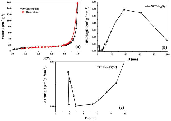 (a) Nitrogen adsorption–desorption isotherm, (b) BJH pore size distribution, and (c) nanopore distribution for the NCC–Fe2O3 composite.
