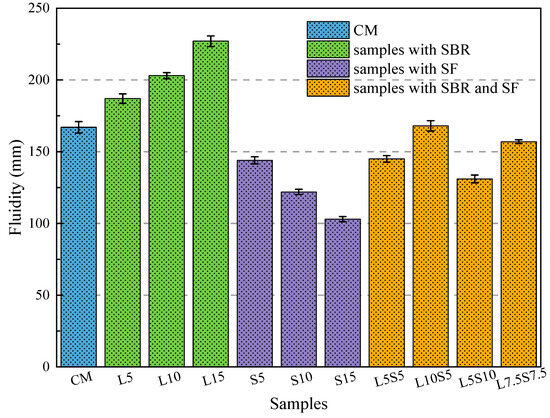 The influence of SBR latex and SF on the fluidity of cement mortar.