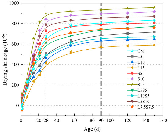 The drying shrinkage of cement mortar was tested according to the “Testing Methods of Cement and Concrete for Highway Engineering” (JTG 3420-2020) [26], with specimen dimensions of 25 mm × 25 mm × 280 mm. The specimens were demolded after 24 h of curing, and the lengths of the mortars were measured at 1, 7, 14, 28, 56, 90, 120, and 150 days after demolding to calculate the drying shrinkage rate using the following Equation (1):