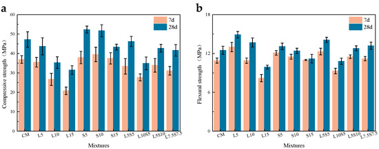 The influence of SBR latex and SF on the compressive strength of mortar is shown in Figure 3a. It can be seen from the graph that as the substitution rate of SBR latex increases, the 7-day and 28-day compressive strength of the mortar shows a continuous decreasing trend. Compared to the baseline specimen, the 28-day compressive strength of L5, L10, and L15 decreased by 7.4%, 25.2%, and 33.3%, with L10 and L15 being only 35.3 and 31.5 MPa. This indicates that when the substitution rate of SBR latex exceeds 10%, it causes significant damage to the compressive strength of the mortar. This is partly due to the reduction in cement usage and partly because the SBR latex adsorbs onto cement particles in the early stages, affecting hydration. Furthermore, the elastic modulus of the latex itself is much lower than that of cement, weakening the mortar’s load-bearing capacity under pressure, resulting in a decrease in compressive strength. Due to the reduction in cement usage, the enhancement of the early compressive strength of mortar by SF was not significant, with the 7-day compressive strength of S5, S10, and S15 being only slightly higher than the cement baseline specimen. It was found that, regardless of the amount of SF added, 3.92% to 5.4% of the SF participated in the pozzolanic reaction, with the remainder filling in the pores, explaining why the 28-day compressive strength of S5 and S10 were similar [29]. For the compound-mixed specimens, L5S5, L5S10, and L7.5S7.5 had lower early strength, but their 28-day compressive strengths were all above 40 MPa, with L5S5 having a compressive strength of 46.2 MPa, close to that of CM. This is because SBR latex not only impedes the hydration of cement particles but also delays the pozzolanic reaction of SF particles with hydration products [30]. The 7-day compressive strength of L10S5 was higher than L10 and L15, and the 28-day compressive strength was higher than L15 but lower than L10, which is because SF can enhance the early strength of mortar, albeit not enough to offset the negative impacts of reduced cement usage and SBR latex. Moreover, the 28-day compressive strength of L5S5 was 23.2% higher than L10 and 10.6% lower than S10; the 28-day compressive strength of L7.5S7.5 was 32.1% higher than L15 and only 3.9% lower than S15, which indicates that, at the same substitution rate, the strengthening effect of SF on mortar compressive strength can be stronger than the damage caused by SBR latex.