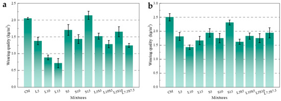 The influence of SBR latex and SF on the wear resistance of mortar; (a) pre-wearing; (b) second wearing.