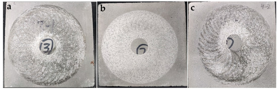 The abrasion resistance of mortar was conducted in accordance with the “Testing Methods of Cement and Concrete for Highway Engineering” (JTG 3420-2020) [26], with specimen dimensions of 150 mm × 150 mm × 30 mm. Initially, the specimens were first worn for 30 cycles under a load of 300 N to remove the effect of surface slurry (pre-wearing), followed by cleaning and wearing for an additional 40 cycles (second wearing) to calculate the amount of mortar abrasion based on the following Equation (2):