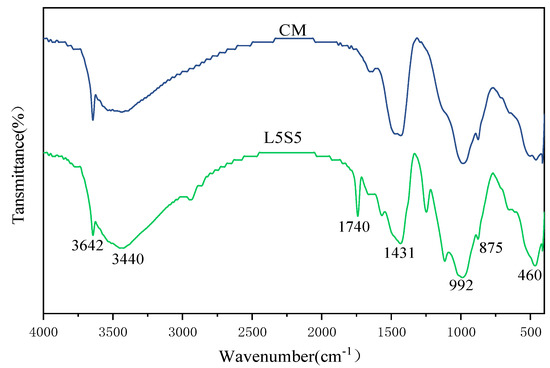 The FT-IR spectrogram results of CM and L5S5 after 28 days of hydration are presented in Figure 7. The infrared absorption band at 460 cm−1 in the FT-IR spectrum corresponded to the symmetrical bending vibration of the Si-O-Si bond, indicating the presence of SiO2 in the product. The infrared absorption band at 870 cm−1 is the characteristic absorption band of ettringite (AFt). The transmittance of this absorption peak in CM was significantly higher than in L5S5, indicating a higher content of AFt in the mortar without SBR latex and SF. The infrared absorption band at 1431 cm−1 corresponded to the bending vibration of carbonate ions, indicating the presence of calcium carbonate in the mortar. The peak at 992 cm−1 corresponded to the -SiO4 phase and was present in both CM and L5S5 mortars. The infrared absorption band at 1740 cm−1 in the spectrum of L5S5 corresponded to C=O. Complexation between the carboxyl group of SBR latex and Ca2+ ensured that the polymer film adhered more closely to the hydration products, thus increasing the chemical adsorption between the hydration products and the polymer, which led to the formation of the polymer-hydration product-aggregate linkage structure, enhancing the cohesion of the composite material [31]. There was no C=O infrared absorption peak in the spectrum of CM. The absorption band at 3642 cm−1 was caused by the stretching vibration of the O-H bond and is characteristic of Ca(OH)2. This peak showed the same characteristics as the AFt absorption peak, indicating a higher content of Ca(OH)2 in the mortar without SBR latex and SF.