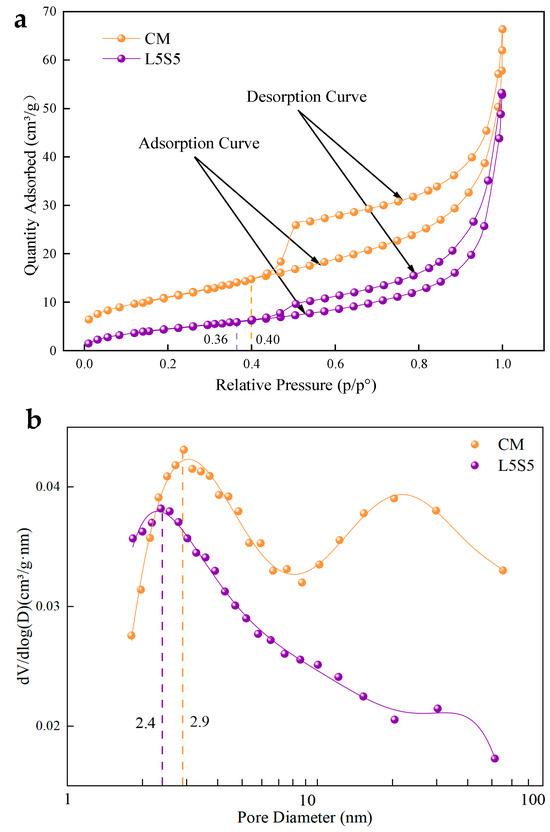 The pore structure of CM and L5S5 pure pulp after 28 days of hydration; (a) adsorption–desorption curve; (b) distribution of pore size.