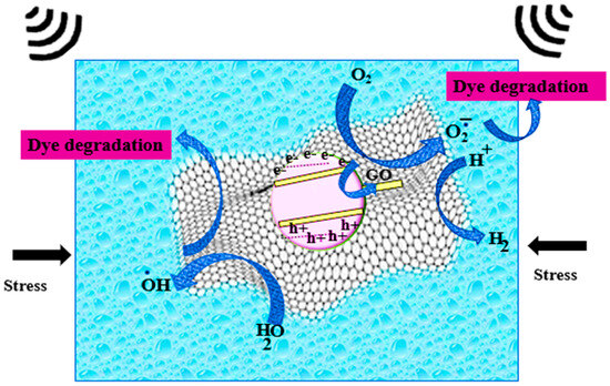 Figure 1 explains how an electron–hole pair is generated under ultrasonication stress, which creates a reaction with OH and O2 and converts them into reactive radicals such as O2− and OH−, respectively, causing the degradation of organic dyes. If the external stress is removed, the O2− and OH− radicals become insufficient for the efficient catalytic degradation of dyes.