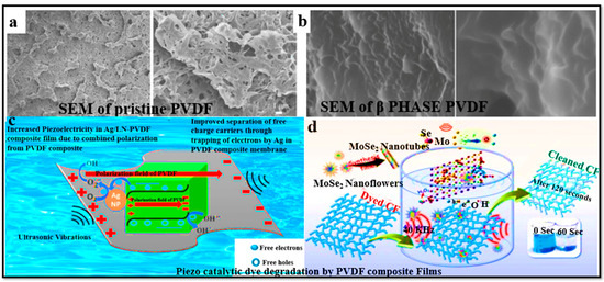 Figure 3 illustrates that the alpha to beta structure of PVDF under specific conditions makes it very interesting in the field of piezoelectric materials from a technological point of view [84]. The alpha to beta transformation and kinetics can be confirmed by Fourier-transform infrared (FTIR) spectroscopy. The d33 coefficient (piezoelectric coefficient) of PVDF = 13 ± 28 Pc/N is comparatively [81] higher than that of other polymers but less than that of ceramic materials. When some suitable inorganic materials are doped with PVDF, they may increase the dipole moment [85]. A modeled β-phase PVDF [86] results in different theoretical calculations of its quantum chemistry, which helps to provide different piezoelectric values. When the dielectric permittivity e− = 5 (which indicates how well a material can be polarized by an electric field), the d33 range was found to be 716.6 to 719.2 pC/N; for the dielectric permittivity e = 10, its range was found to be 733.5 to 738.5 Pc/N [87]. The redistribution of molecular orbitals results in the displacement of atomic nuclei and the reorganization of charges under an electric field, which causes a negative piezoelectric effect. The morphological structure of PVDF can be observed at the atomic level by scanning electron microscopy, as shown in Figure 4a,b. Scanning electron microscopy can reach an atomic resolution below 0.05 nm, so it is very helpful in determining PVDF’s morphology and the locations of atoms in PVDF segments [84]. Figure 4 c,d also demonstrate the utilization of piezoelectric catalytic membranes sand materials for dye degradation via the generation of free radicals through piezoelectric activity.
