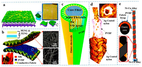 PVDF-based textiles as piezoelectric materials [90]. (a) PVDF NFs on top of PET fabric to obtain a highly flexible, tailorable, breathable, and washable fabric, designed by slicing two PET materials in half and placing a conductive fabric between them. (b) A piezoelectric and triboelectric hybrid nanogenerator (PTHNG) fabricated entirely of nanofibers by electrospinning PVDF and silk fibroin nanofibers on conductive textiles. (c) A piezoelectric nanogenerator with ZnO nanowires and a PVDF polymer as a piezoelectric layer. (d) A triaxial braided PVDF yarn harvester made by braiding nylon yarns and coated with a conductive and piezoelectric PVDF melt. (e) An elastic core with a piezoelectric polymer PVDF on a helical structural fiber-based PENG. This image is a modified version of an image from an article originally published in the Journal of Advanced Materials by Kai Dong et al.