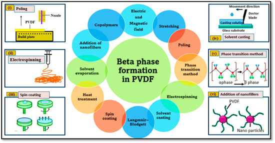 The β-phase content in PVDF is responsible for its piezoelectricity. Several methods can be used to induce the β phase in the PVDF polymer [103], including poling, electrospinning, spin coating, solvent casting, phase transitions, the addition of nanofillers, the application of electric and magnetic fields, stretching, the Langmuir–Blodgett method, heat treatment, solvent evaporation, and copolymers, as illustrated in Figure 6. These approaches aim to enhance the beta phase of PVDF, leading to improved piezo-catalytic properties and dye degradation. A significant enhancement in the β-phase content of PVDF was observed after the addition of fillers in the PVDF polymer matrix, such as ceramics, carbon-based materials, metal oxides, and graphene [6]. Some of these methods to enhance the beta phase of PVDF are stretching [104], electric poling [48], solvent casting, the addition of nucleating fillers, phase transitions, or copolymer development [105].
