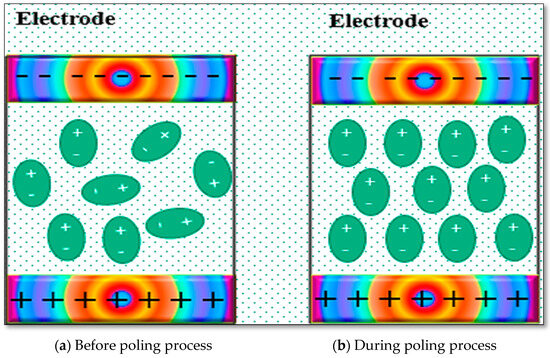 The piezoelectricity can be enhanced by poling at elevated temperatures, which causes the reorientation of the hydrogen and fluorine atoms of the PVDF structure in the direction of the applied electric field [108]. Strong piezoelectric properties can be achieved by the polarization of polyvinylidene difluoride polymers. Poling helps to arrange the randomly oriented dipole moments in the polymer matrix. As can be observed in Figure 7a, the positive terminals are not aligned in the direction of the applied electric current. However, Figure 7b illustrates the alignment of the terminals in the direction of the applied electric field after the poling process. The best piezoelectricity can be obtained by applying an electric field of up to 200 MV/m, which is difficult to achieve [109]. According to the literature, 160 MV/m is the maximum electric field that is usually set for the electrical poling of PVDF.