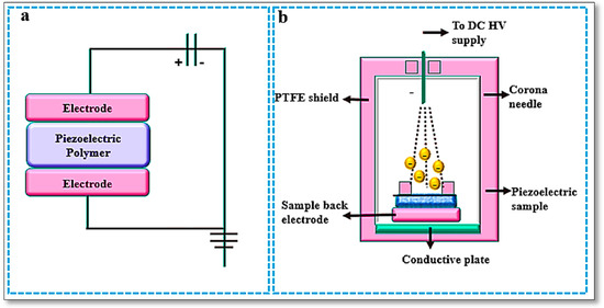 (a) Direct contact method: In this method, a high voltage is applied through a conductive electrode across the polymer (Figure 8a). The voltage used in the direct contact method should be a sinusoidal DC or triangular, low-frequency AC waveform. The range of voltages of the applied electric field required across the polymer chain is 5 to 100 ΜV/m. Factors that affect the poling in polymeric materials are the time and strength of the applied electric field, impurities, and the uniformity of the polymer surface [91].
