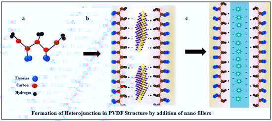 Mechanism of heterojunction formation in PVDF by addition of nanofillers. (a) PVDF matrix. (b) Nanofillers. (c) Formation of the beta phase in PVDF.