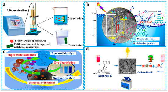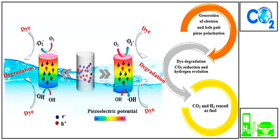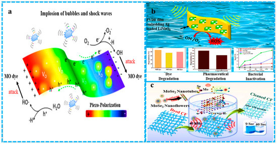 Piezo-catalysis is an advanced oxidation process in which reactive oxygen species such as superoxide (•O2−), hydroxyl radicals (•OH), and singlet oxygen are generated by high-energy ultrasound waves or low-frequency vibrations [150,151,152]. During piezo-catalysis, electron and hole pairs are generated and undergo piezoelectric redox reactions. During water purification, these ROS undergo oxidation and reduction reactions with dissolved pollutants. The generation of reactive oxygen species by piezo-catalytic materials depends on the piezoelectric coefficient, d33, and is directly prepositional to ds [153,154]. Some classes of dielectric materials exhibit piezoelectric properties when mechanical energy is applied. Piezo-polymeric materials such as polyvinylidene fluoride (PVDF) with nanocomposites achieve an increased piezo-active phase. Stress induces piezo potentials in such membranes, due to which free electrons and holes produce separate charges effectively in opposite directions [155]. Periodic ultrasonic irradiation helps to deform doped nanofibers or conducting polymeric materials in the matrices of PVDF membranes [156].