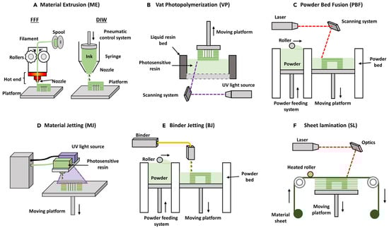 Schematic representations of 3D printing techniques []. Reproduced from [], with permission from Elsevier and Copyright Clearance Center, 2023.